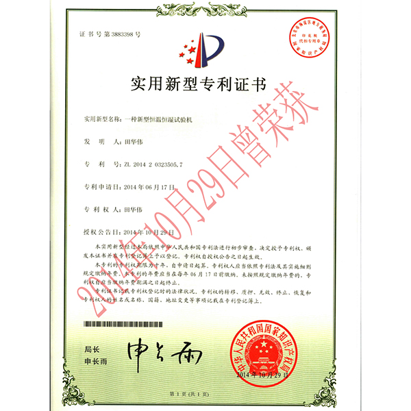 [下一篇: 氙灯老化试验机-专利证书]